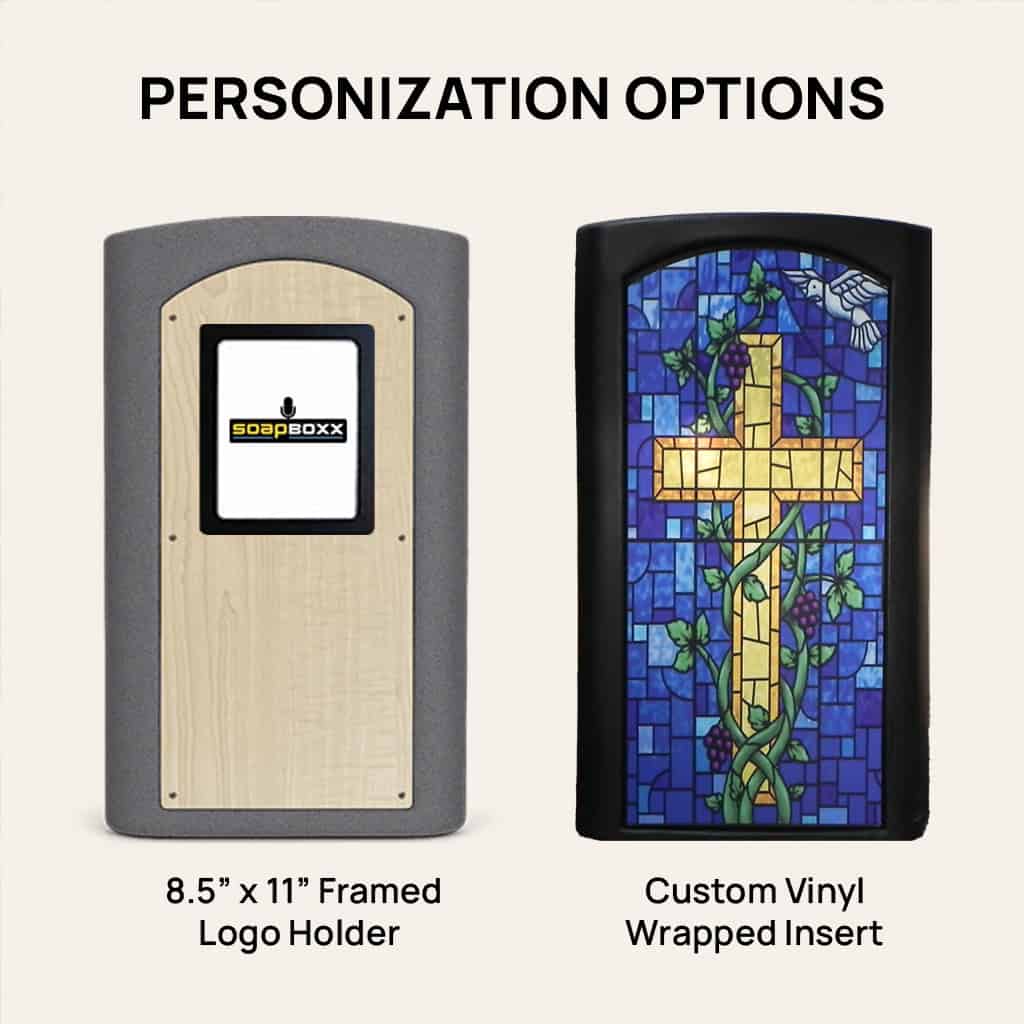 - Custom Vinyl Wrapped Insert: We'll cut out your podium insert and have it wrapped in any design with your logo, text, or any image you'd like. Either provide the artwork you'd like us to use or one of our artists will assist in the perfect design. At SoapBoxx, you can create the perfect podium & lectern. Order now!